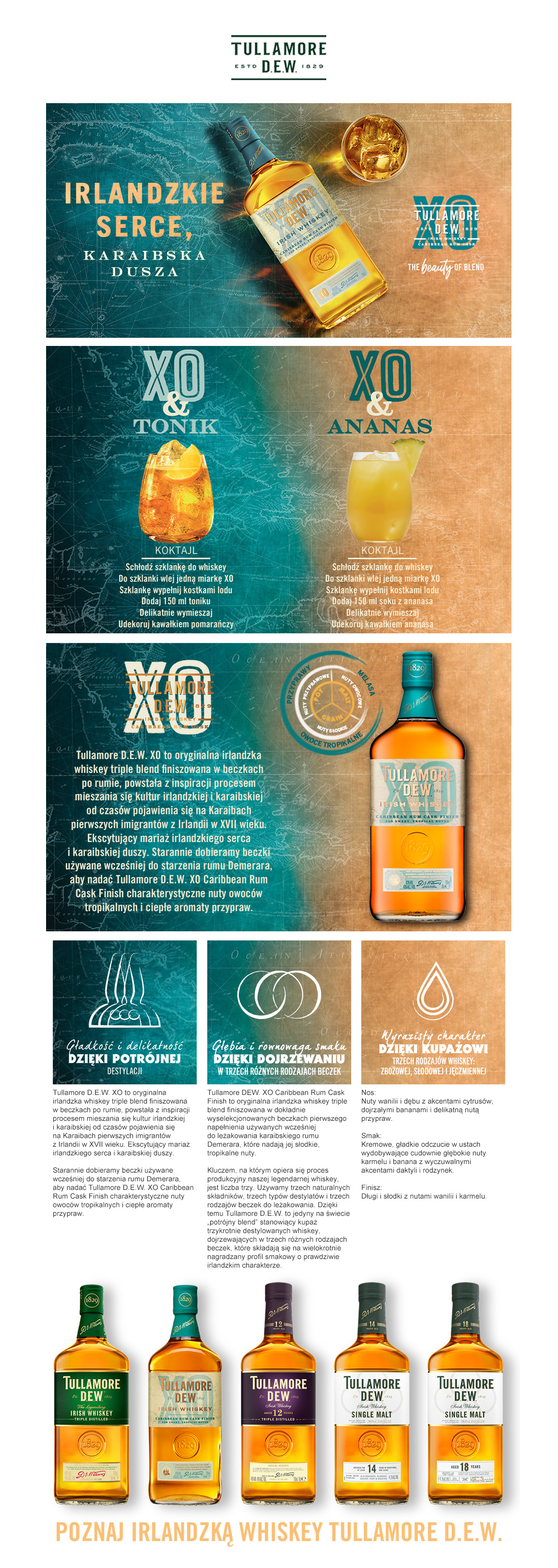 Klasyczny blend trzech rodzajów irlandzkiej whiskey, dodatkowo dojrzewający w beczkach po karaibskim rumie. Ta whiskey jest hołdem dla połączenia kultury irlandzkiej i karaibskiej, rozpoczętego w XVII wieku dzięki pierwszym Irlandczykom, którzy wyemigrowali na Karaiby. Starannie dobierane beczki użyte wcześniej do leżakowania ciemnego rumu, aby nadać Tullamore D.E.W. XO Caribbean Rum Cask Finish charakterystyczne nuty owocowo-tropikalne i ciepłe aromaty korzenne.